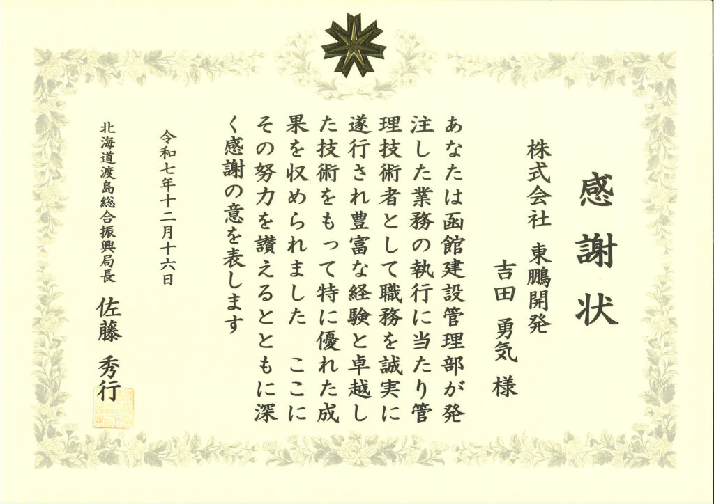 令和7年12月18日、函館建設管理部において「令和7年度優秀現場代理人等表彰式」が行われ、当社が担当した業務が、優秀な成果をおさめたとして、優秀管理技術者(委託部門)を受賞いたしました。